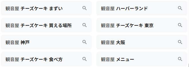 「観音屋チーズケーキ」をネットで検索すると、「観音屋チーズケーキ まずい」と表示されます。