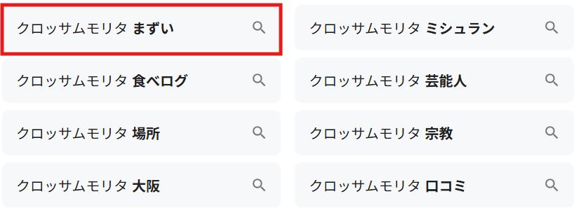 「クロッサムモリタ」をネットで検索すると、「クロッサムモリタ まずい」と表示されます。