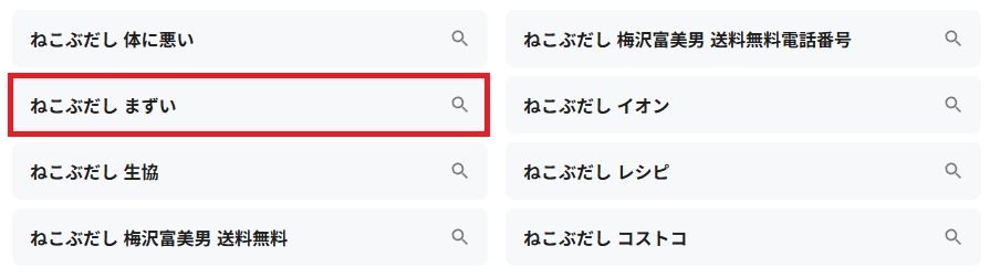 「ねこぶだし」をネットで検索すると、「ねこぶだし まずい」と表示されます。