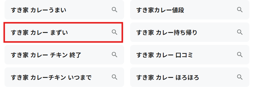 「すき家」をネットで検索すると、「すき家カレー まずい」と表示されます。